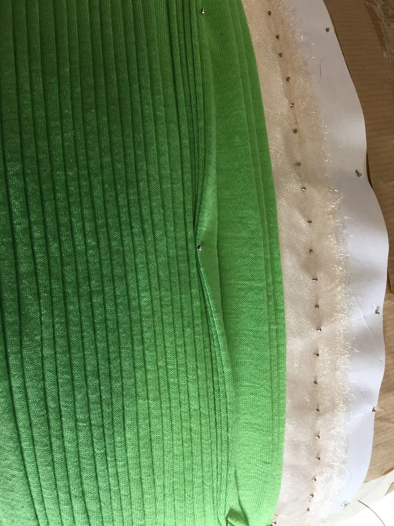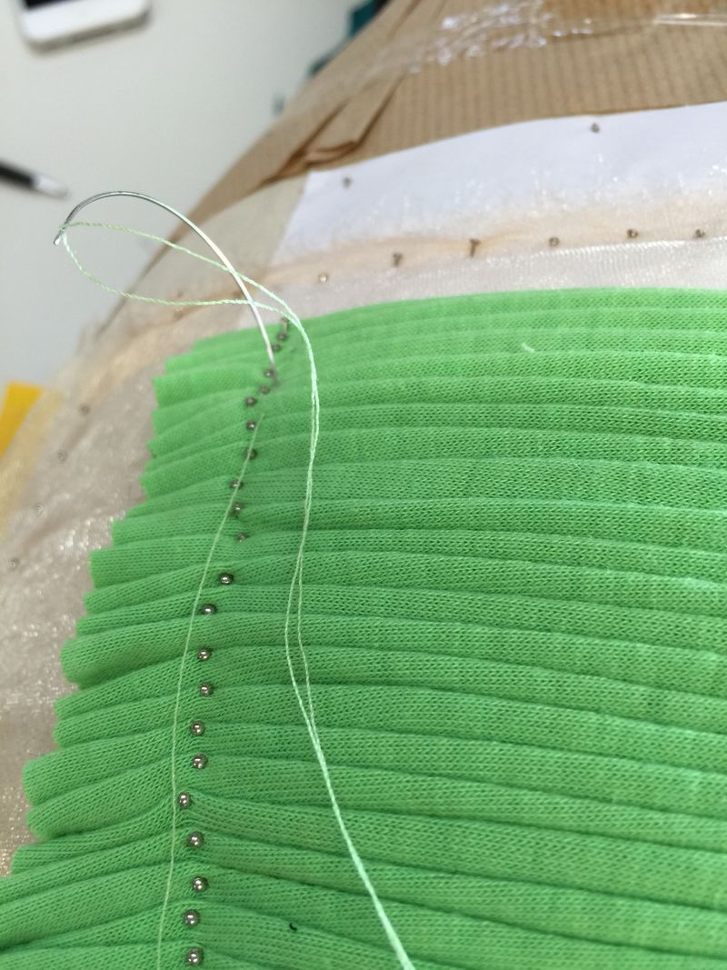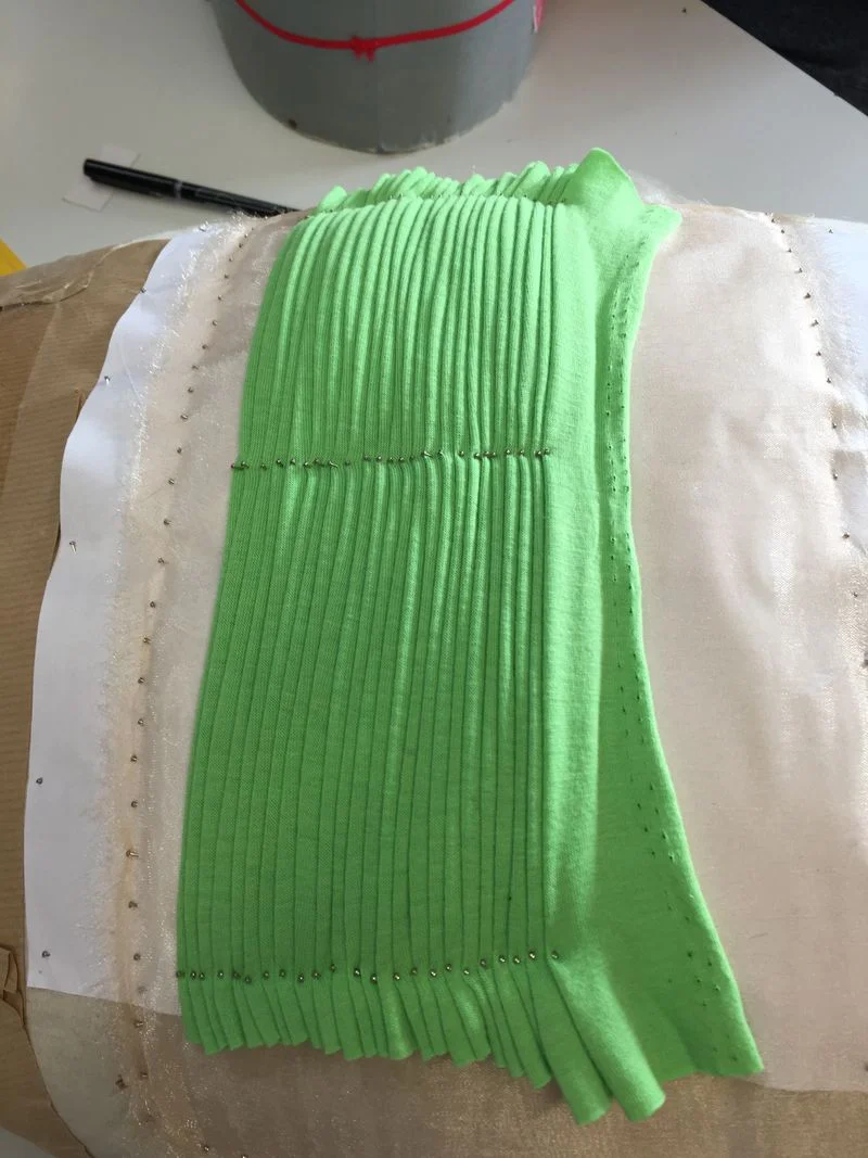 Once the pleats are completed and all are the exact same size, the fabric is transferred to the dress form.