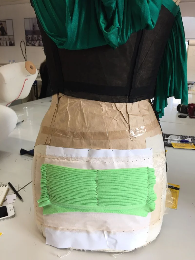 The paper is placed on the dress form, and pinned very tightly adding folds or darts until it lays flat and then the organza is pinned in place on top, again pulled until it is perfectly flat.