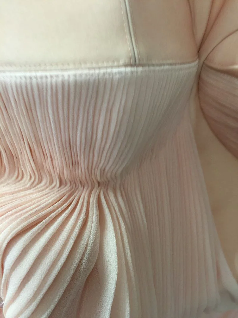 The pleated dresses are attached to a very light corset..made by using two layers of silk organza - one on grain and one of the cross of grain for strength.