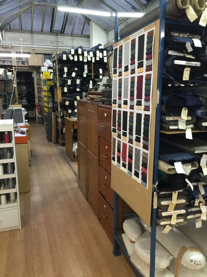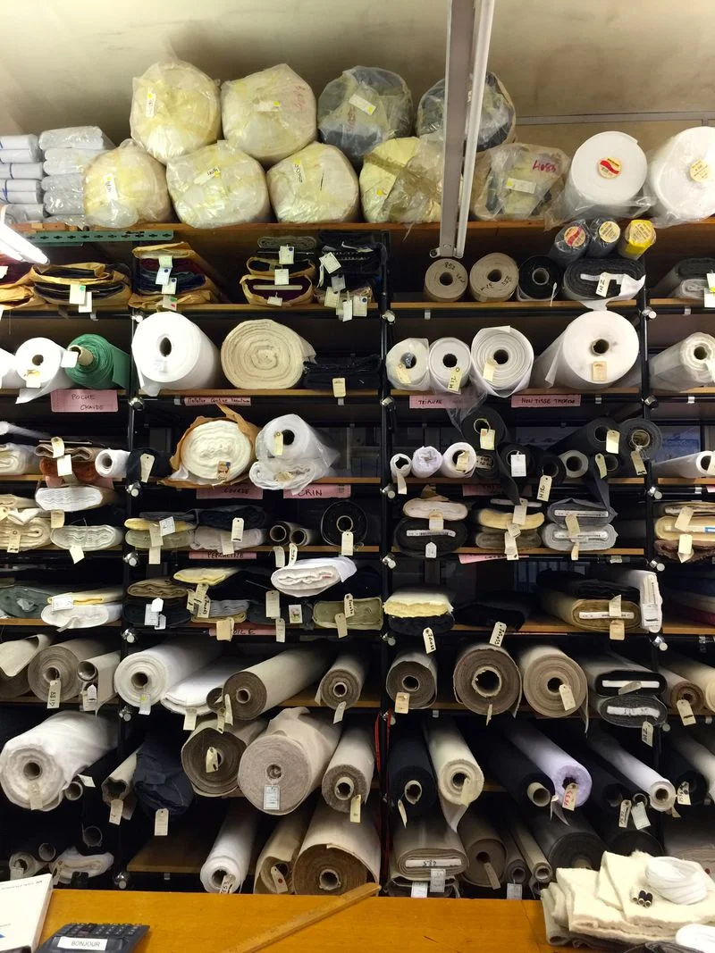 Its filled with bolt after bolt of hair canvas, chest canvas, felt, underlining, interlining, sleeve heads, shoulder pads...all in different weights, sizes, shapes and colours....